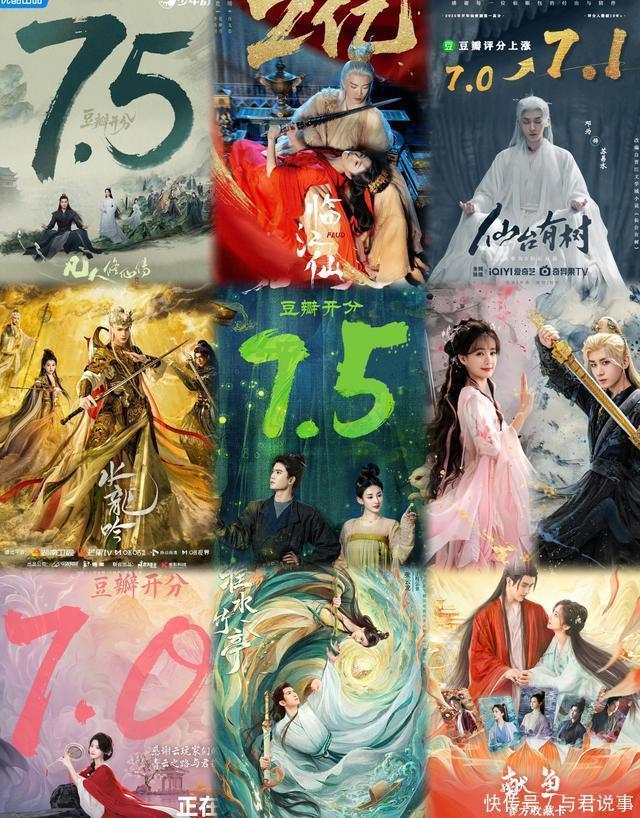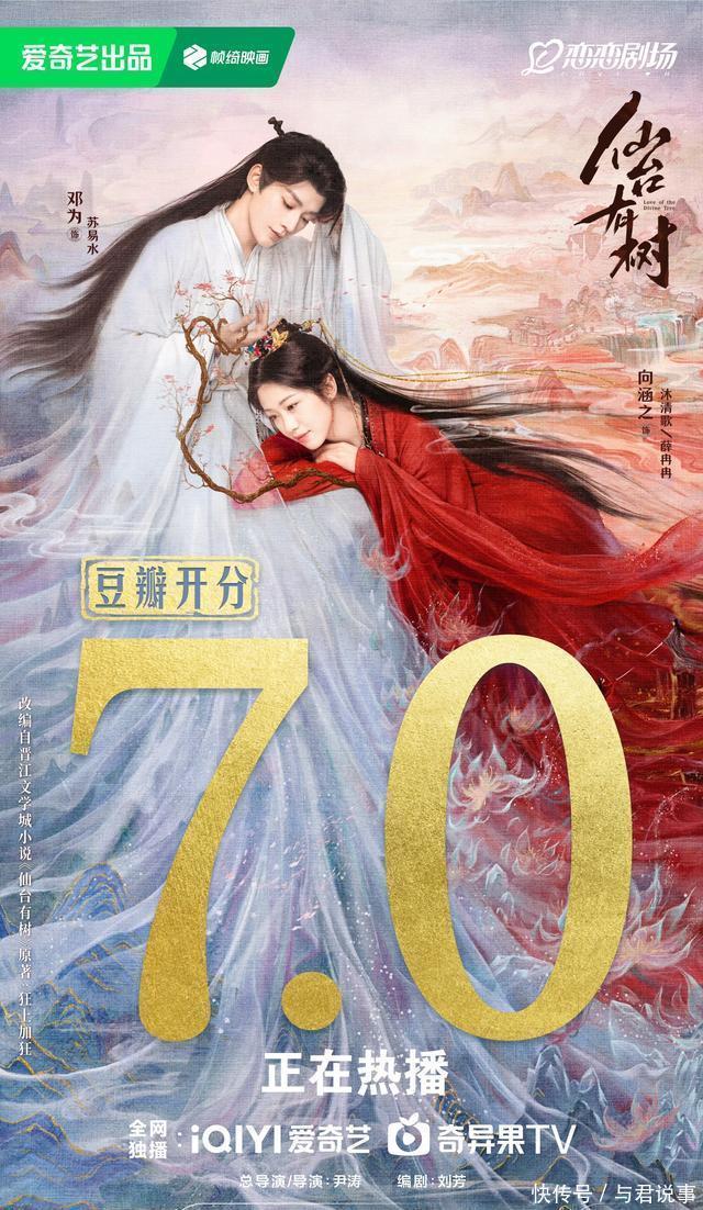 四、爱奇艺《仙台有树》 邓为、向涵之领衔主演的古装仙侠剧。 豆瓣评分7.1分 《仙台有树》在“无IP加持”,以其新颖的“换乘师徒”设定,实现以A+成本收获S+级商业收益,剧集打破了传统仙侠虐恋的套路,以“御姐风和小狼狗”的人设,将师徒两身份对调,这种“师徒禁忌之恋”真的太好嗑了! 《仙台有树》把“全员摆烂不想飞升的咸鱼”理念搬进仙侠里,在爱奇艺站内热度峰值8500+,累计播放量8.4亿,豆瓣开分7.0,后期升至7.1分。